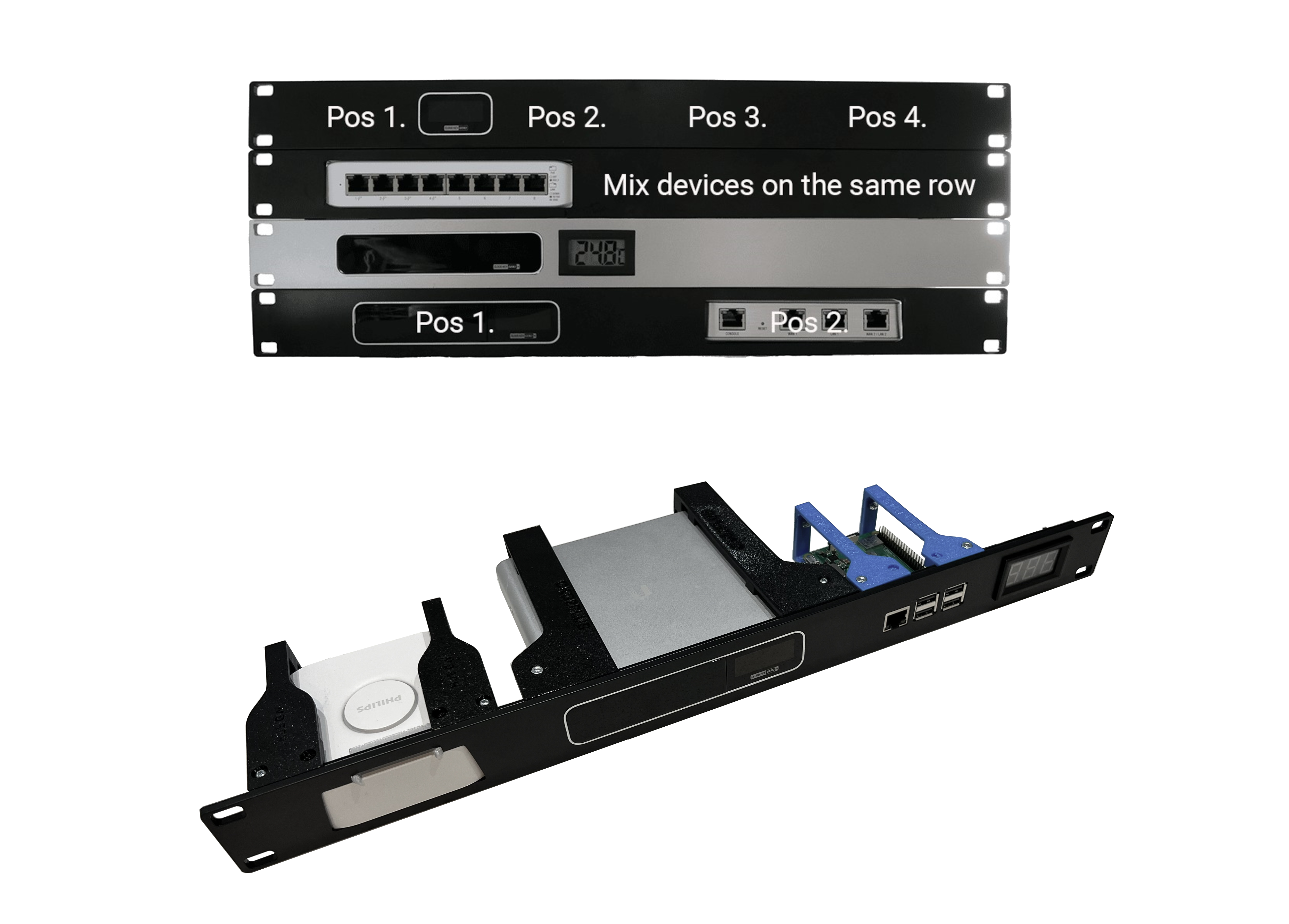Nu kan du montera utrustning ej avsedd för rackmontage i rack i anpassade konsoler! Vi tillhandahåller en formsprutad stabil frontpanel med CNC-fräst hålbild och en 3D-printad konsol på baksidan av frontpanelen. Den ger dig möjlighet att montera utrustning i rack som från början var avsedd för desktop placering. Vi har ca 300 färdiga enheter och antalet växer hela tiden. Finner du inte den utrustning du vill montera i listan så kontakta oss. Om det är en vanlig produkt kan vårt team ta fram en lösning inom ca 2 veckor. Om det är en unik produkt så kan du sända en 3D-CAD fil till oss så tar vi fram en konsol åt dig. OBS! Panelen levereras ej med fysiska Enheter. Saknar du någon modell? Hör av dig till oss så ordnar vi det.