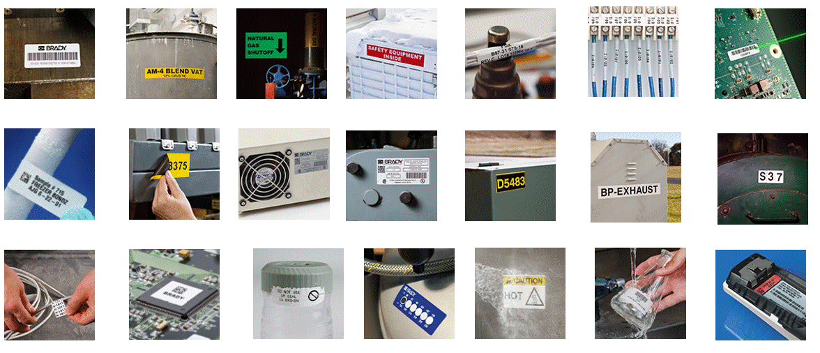 Olika materialtyper nylon, krympslangar, vinyl och självlaminerande etiketter.
