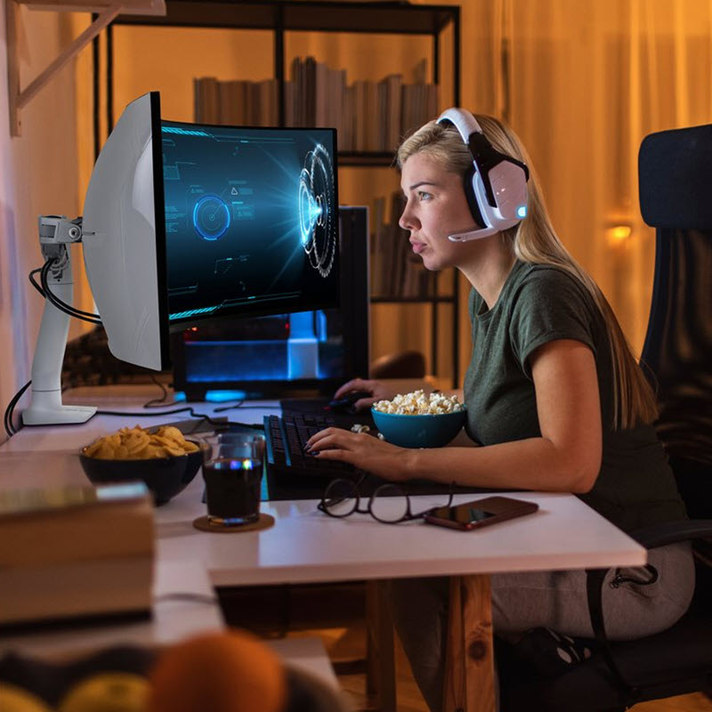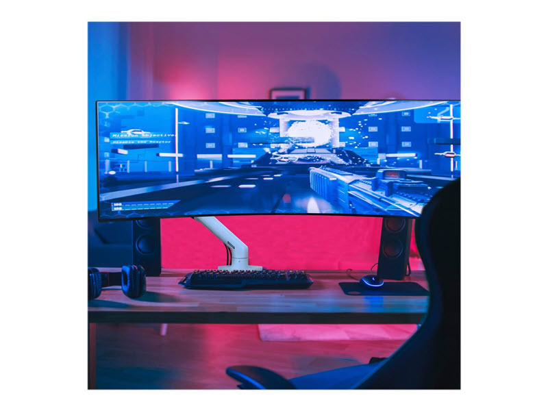 HX-skärmarmen med en kraftfull lutningsvinkel ger spelare och kontorsarbetare friheten att röra sig och placera ultrabreda, böjda skärmar.