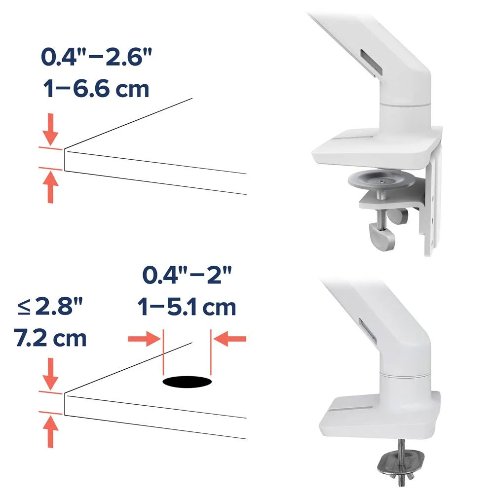 Bordklemmen festes til en overflatekant som er 1,0–6,6 cm tykk. Grommet-festet festes gjennom overflatehull. * Skjermen kan dreies 360° ved tilkoblingspunktet for arm og forlengelse. Dreiing er begrenset til 180° ved tilkoblingspunktet for forlengelse og base † Vippeområde: 15° bakover, 5° fremover Monteringsstandarder: VESA MIS-D, 75/100 (hullmønster = 100 x 100 mm og 75 x 75 mm)