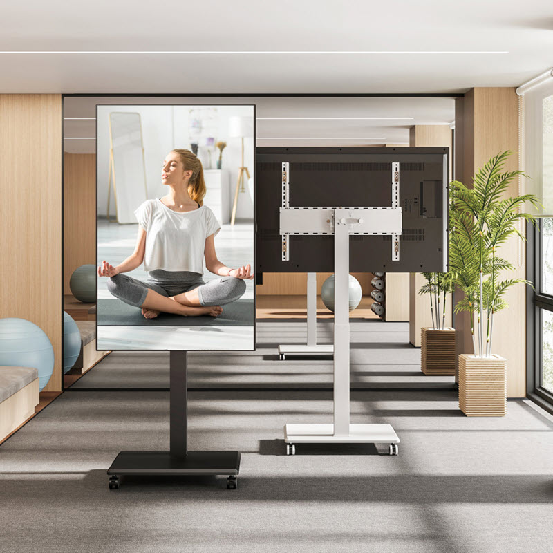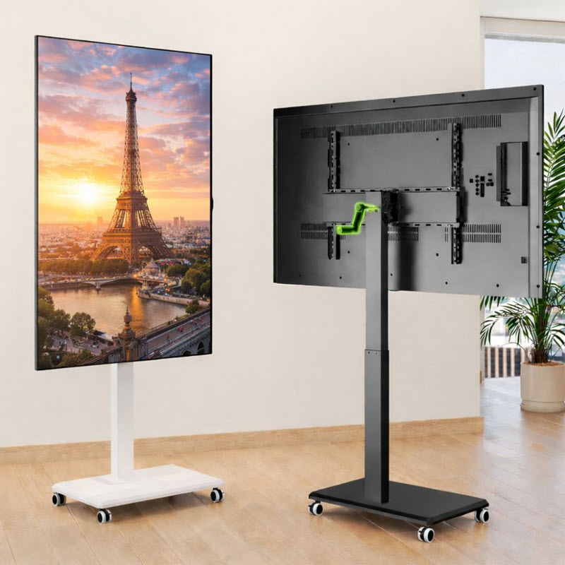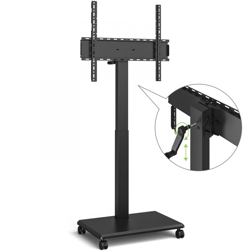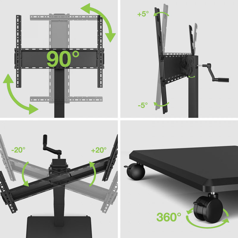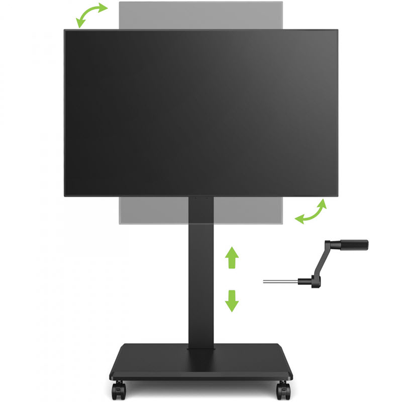 Med den medföljande handveven kan du rotera skärmar upp till 75" och 50 kg, från horisontell till vertikal visning på ett snyggt mobilt golvstativ med hjul.