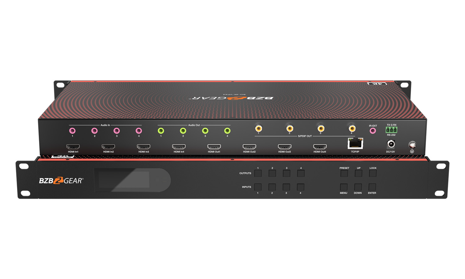 BG-4K-VP44 erbjuder flera kontrollmetoder, inklusive knappar på frontpanelen, IR-fjärrkontroll, RS-232 eller IP-styrning. Den medföljande IR-mottagaren gör det möjligt att styra enheten med den medföljande fjärrkontrollen även när den är placerad utom synhåll för en ren installation.