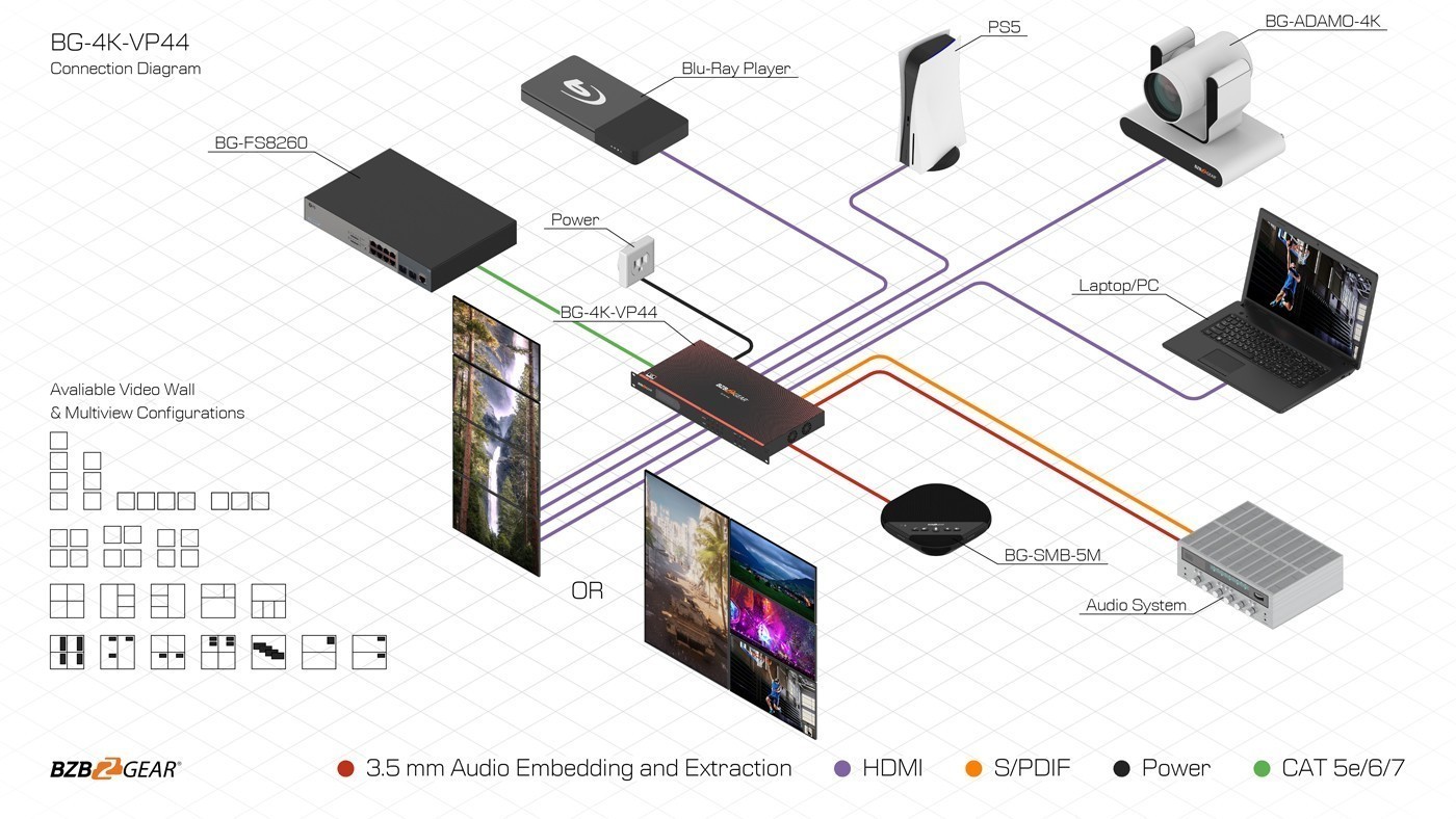 BG-4K-VP44 är en kraftfull videoprocessor som stöder fyra HDMI-ingångar som kan routas oberoende till HDMI-utgångar. Enheten kan skapa videoväggar, fungera som en multivy och utföra matrisfunktioner! BG-4K-VP44 stöder videoväggskonfigurationer med upp till 7 olika lägen för varje monitor. Den kan också visa fyra bilder på samma skärm och har flera olika lägen för delad visning. Läs mer