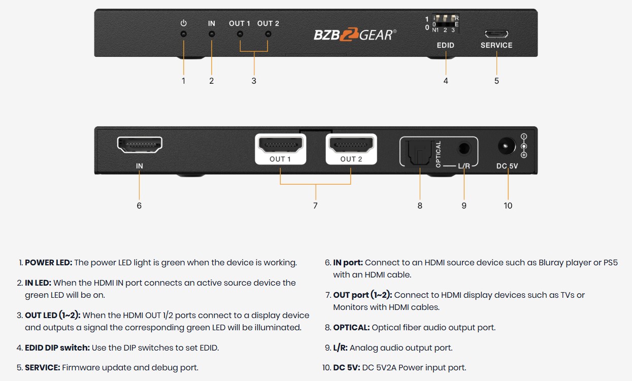 Med avancerad EDID-hantering och ljudextrahering är BG-8K-DA12A utformad för maximal flexibilitet och kompatibilitet med ett brett utbud av HDMI-enheter. Oavsett om du delar en enda HDMI-källa med två skärmar eller behöver splitta en signal för en presentation eller ett event, levererar denna splitter högkvalitativ video upp till 8K@60Hz med 4:2:0 chroma subsampling.