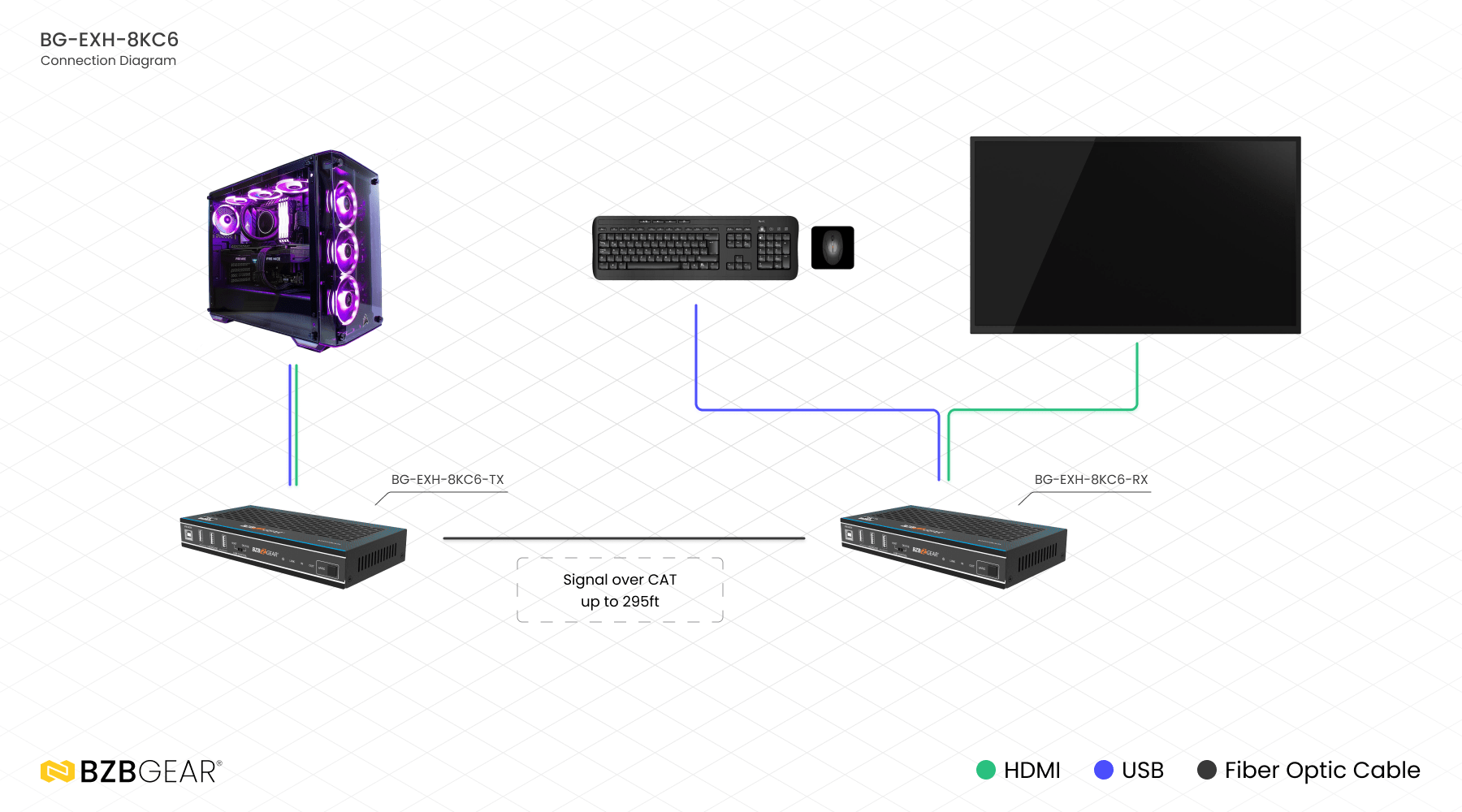 Enheten möjliggör även överföring av USB 2.0-signaler med konfigurerbara värd-/enhetsinställningar per enhet samt dubbelriktad Power over Cable (POC). För hem- eller kommersiella tillämpningar som kräver långdistansöverföring av signaler är BG-EXH-8KC6 den idealiska 8K-signallösningen.