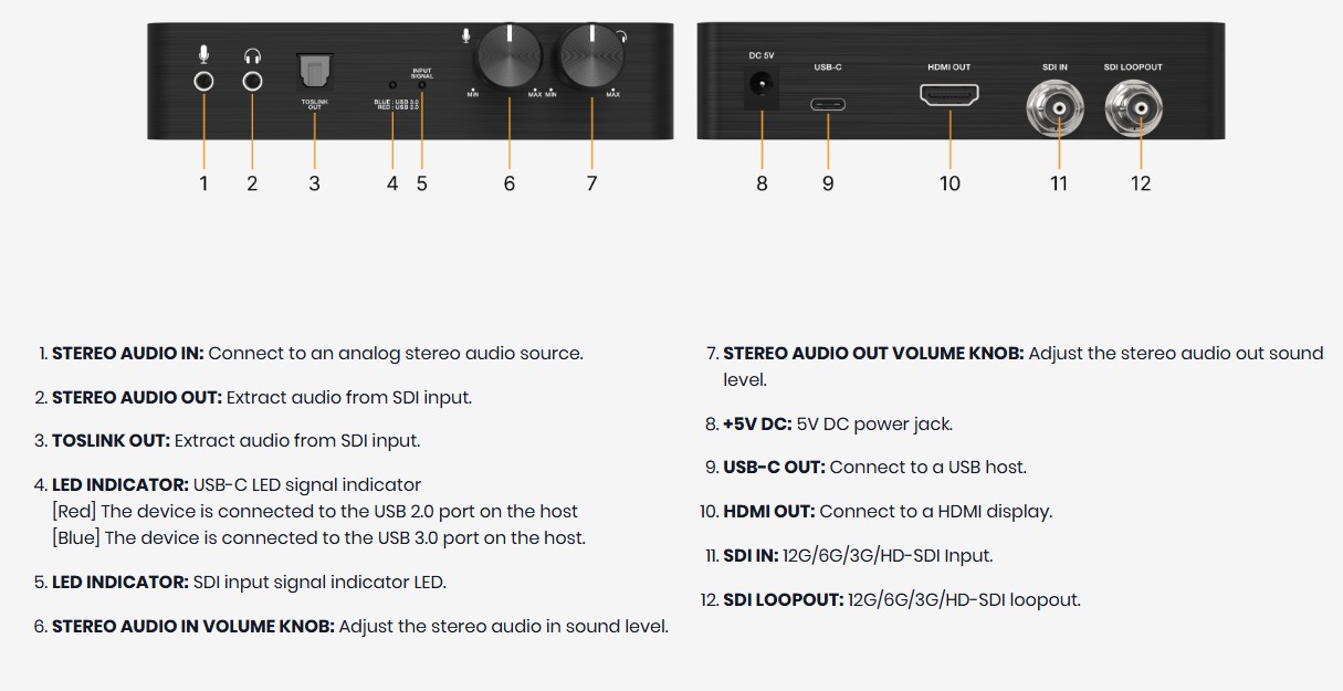 BG-12GCSA är en USB-C 12G-SDI videoinspelningsenhet med scaler, HDMI 2.0/12G-SDI loopout och ljud som erbjuder ett professionellt sätt att fånga SDI-videosignaler. Den använder en USB 3.1 Type-C Gen 1 (USB 3.0) anslutning, vilket möjliggör hög hastighet för dataöverföring. SDI-ingången och loopouten kan dessutom stödja upp till 4K2K@60. Läs mer