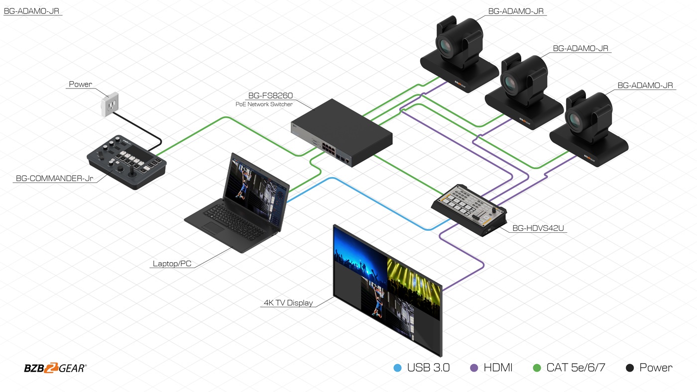 BG-ADAMO-JR är en helt ny Full HD PTZ-kamera med tre typer av objektiv: 12x optisk zoom med 70,3° FOV, 20x optisk zoom med 60,04° FOV och 30x optisk zoom med 58,1° FOV. Kameran erbjuder smidiga PTZ-funktioner, avancerad bildbehandling och flexibla anslutningsmöjligheter. BG-ADAMO-JR ger även stöd för NDI|HX3 i modellen BG-ADAMO-JRND och Dante AV-H i modellen BG-ADAMO-JRDA. Kamerans auto-tracking använder avancerade AI-algoritmer för att upptäcka och följa människor med hög precision. Systemet använder endast en kamera och ett objektiv. Kameran stöder HDMI, SDI, USB 2.0, USB 3.0 och LAN. Den stöder även IP-streaming för flexibilitet i arbetsflödet. Läs mer