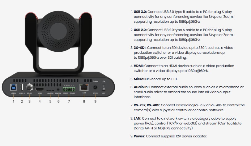 Nätverksprotokoll: ONVIF, RTSP, RTMP, GB/T28181, RTP multicast, VISCA över IP.