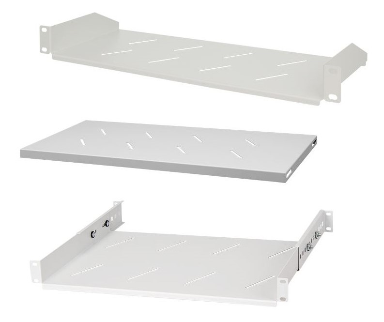 19” hyllor för installation i teknikskåp. När behovet för montering av utrustning utan 19” monterings möjlighet så kan du istället välja att montera en hylla i ditt skåp där du enkelt kan placering din utrustning. Finns för både fast montering och för justering i djupled.