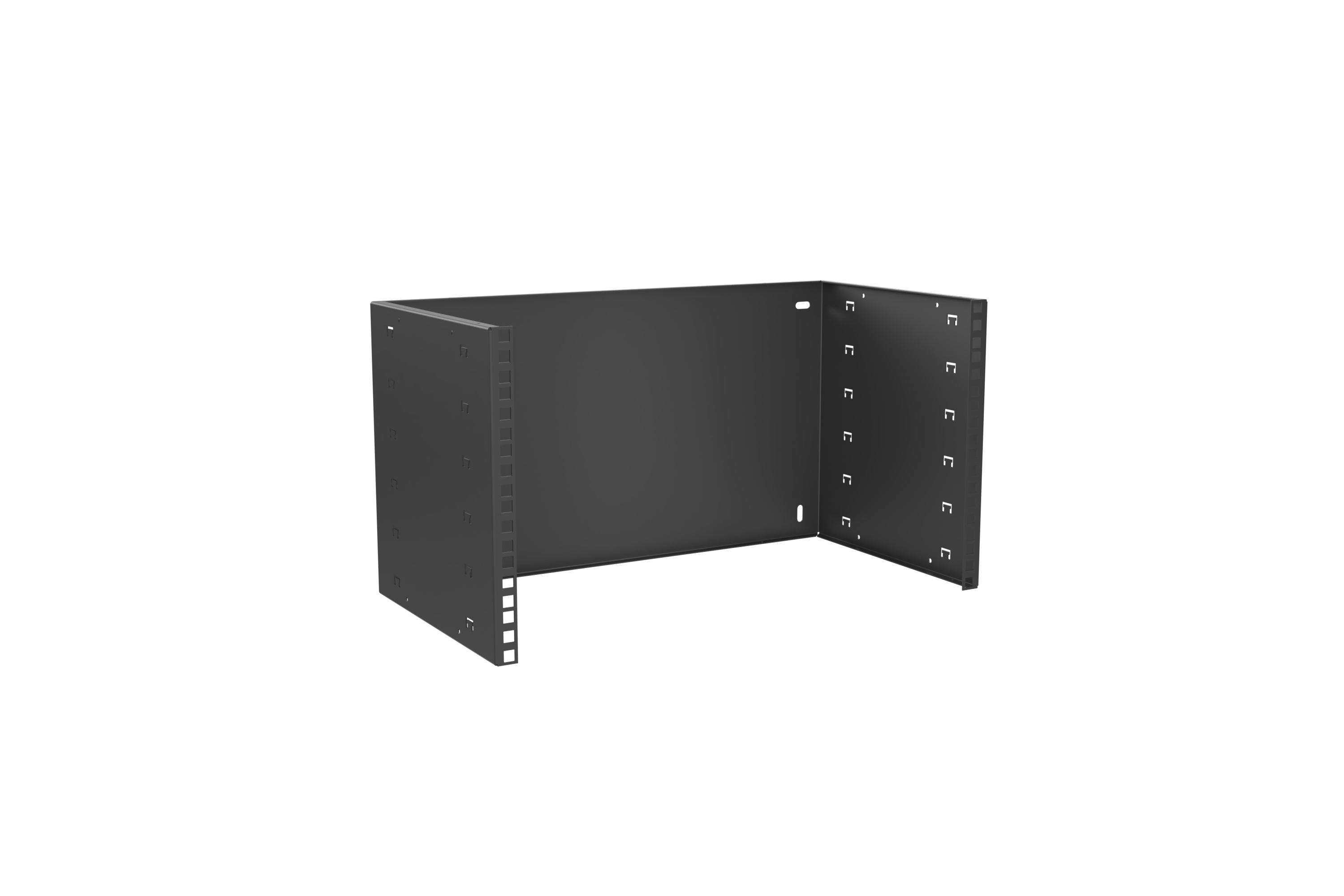 Enklaste möjliga väggram, för montering av korskopplingspaneler, hubbar eller annan 19"-utrustning. Kåpa och passande hylla beställes separat. Ramen skruvas direkt i väggen. Svart strukturlack. HE = 44,45 mm