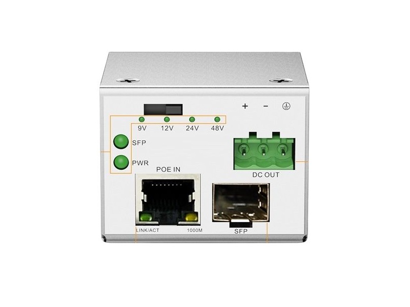 Till skillnad från enklare mediekonverterare levererar enheten justerbar DC-utgång via en klassisk DC5521-kontakt, med stöd för 9V, 12V, 24V och 48V. Det gör att du kan anpassa strömförsörjningen efter den anslutna enheten – vare sig det gäller ett LTE-modem på 12V, en äldre accesspunkt på 9V eller ett industriellt nätaggregat som kräver 48V. Val av DC typ görs via en DIP switch på enhetens framsida.