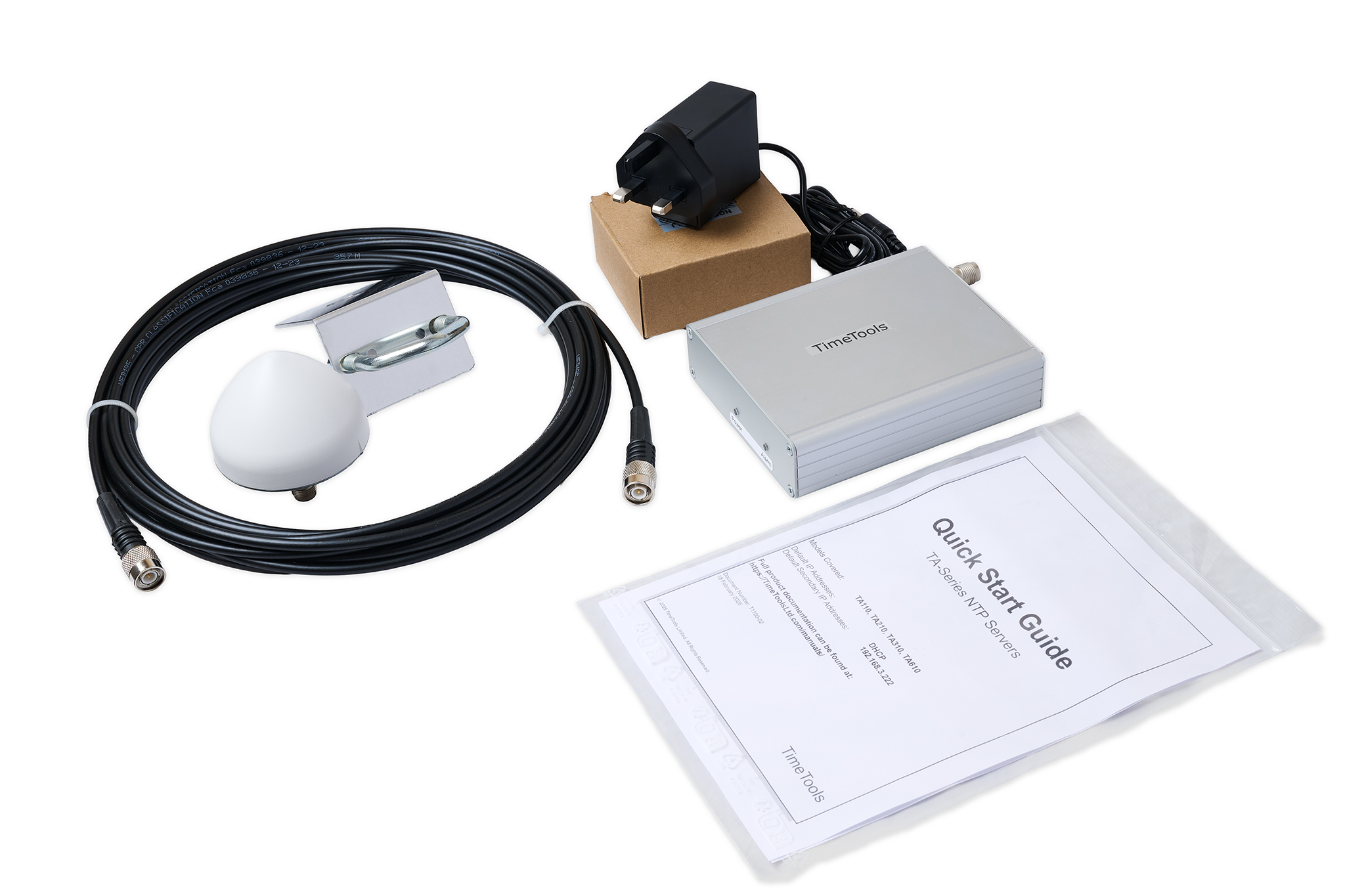 TA110 är security-hardened och stöder NTP-autentisering med MD5, SHA1 och SHA256, samt både IPv4 och IPv6. Konfiguration och övervakning sker enkelt via ett användarvänligt webbgränssnitt, med CLI för avancerade användare. Enheten levereras komplett med GPS-antenn, 20 m lågförlustkabel och universell nätadapter.