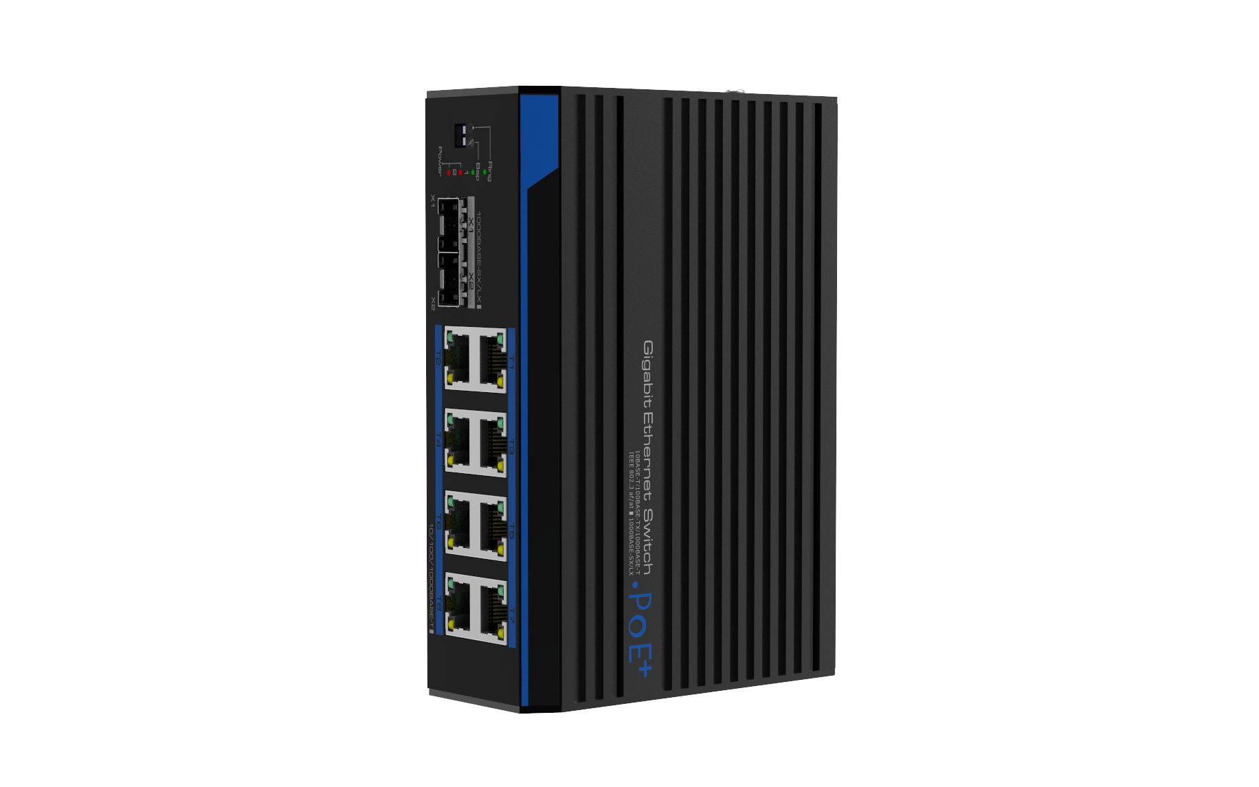 Enheten stödjer 12-48V in och kan förse varje port med maximalt 30W PoE på varje port/RJ45.