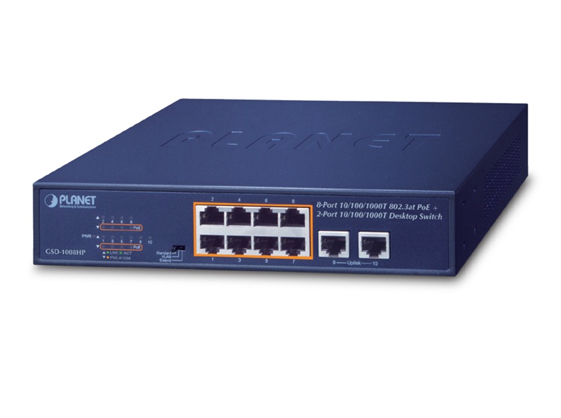 Via en enkel DIP-omkopplare kan GSD-1008HP ställas i "Extend Mode", vilket gör det möjligt att driva enheter på upp till 250 meters avstånd i 10 Mbps-hastighet. Detta är särskilt användbart i större fastigheter, där traditionella 100 meters Ethernet-begränsningar inte räcker till. Den inbyggda VLAN-isoleringen förhindrar dessutom att multicast-trafik eller skadliga DHCP-broadcastar påverkar resten av nätverket – något som ofta är ett bekymmer i övervakningsnät.