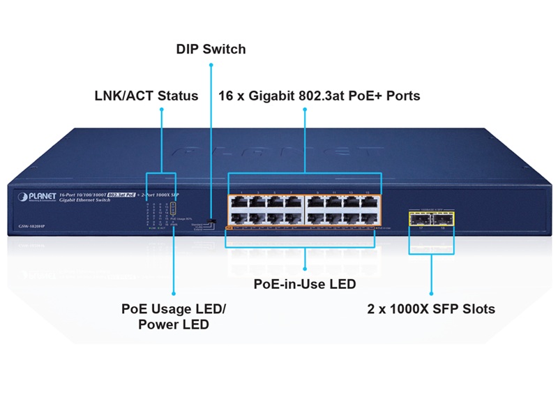 GSW-1820HP är särskilt utformad för att leverera ström och data till PoE-utrustning som IP-kameror, accesspunkter och VoIP-telefoner. Med 16 PoE-portar enligt IEEE 802.3af/at-standard och ett totalt strömbudget på 250 watt, klarar den att samtidigt driva upp till 16 kameror med 15,4W vardera – eller åtta med full 30W-effekt. Detta gör den idealisk i till exempel skolor, kontor, butiker eller industriområden där centraliserad övervakning behövs.