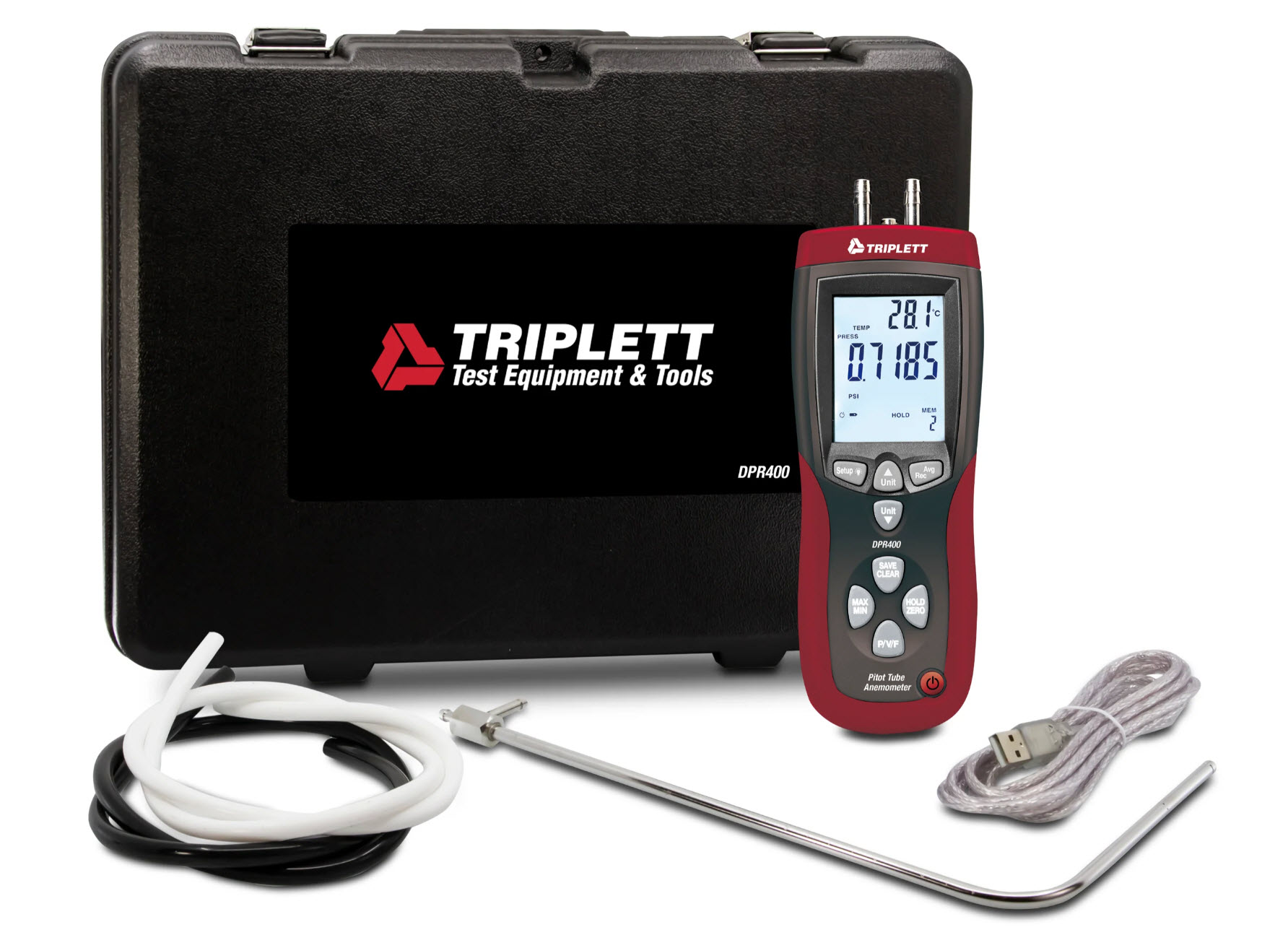 Levereras komplett med Pitot-rör, 2 anslutningsslangar (850 mm), programvara, 9 V-batteri samt robust transportväska för enkel användning och skydd.