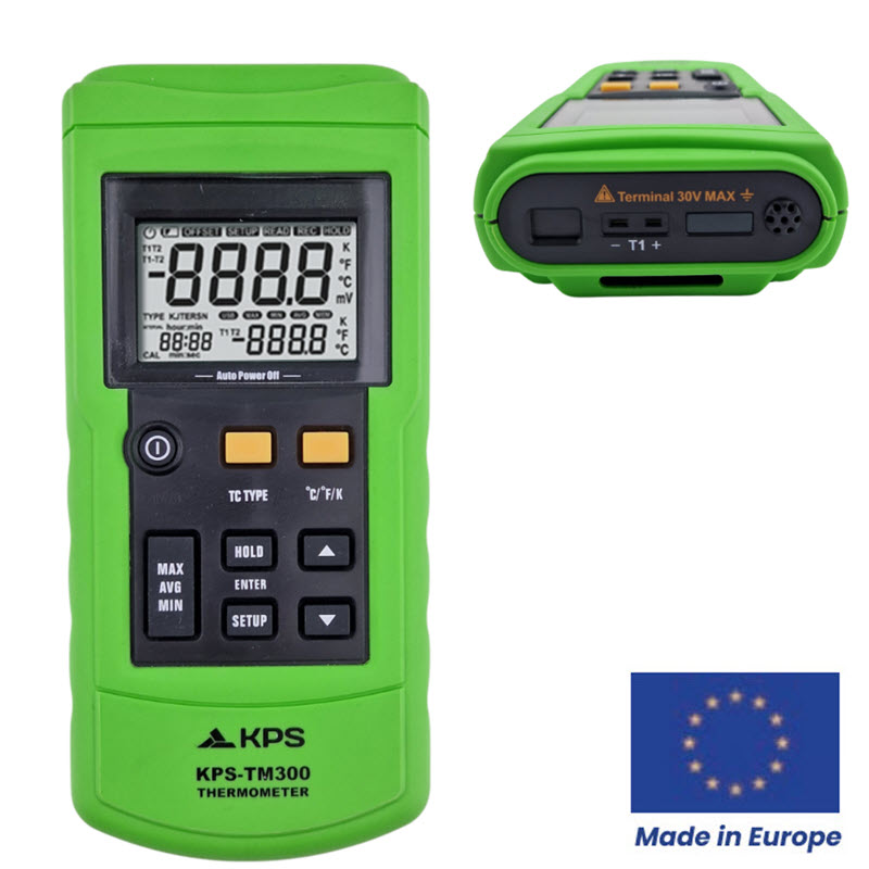 Termometern TM300 täcker ett antal temperaturmätningsbehov. Termometern är kompatibel med termoelement av typen J, K, T och E, och på den bakgrundsbelysta LCD-displayen visa max-, min- och genomsnittliga värden i Celsius (°C), Fahrenheit (°F) och Kelvin (K).