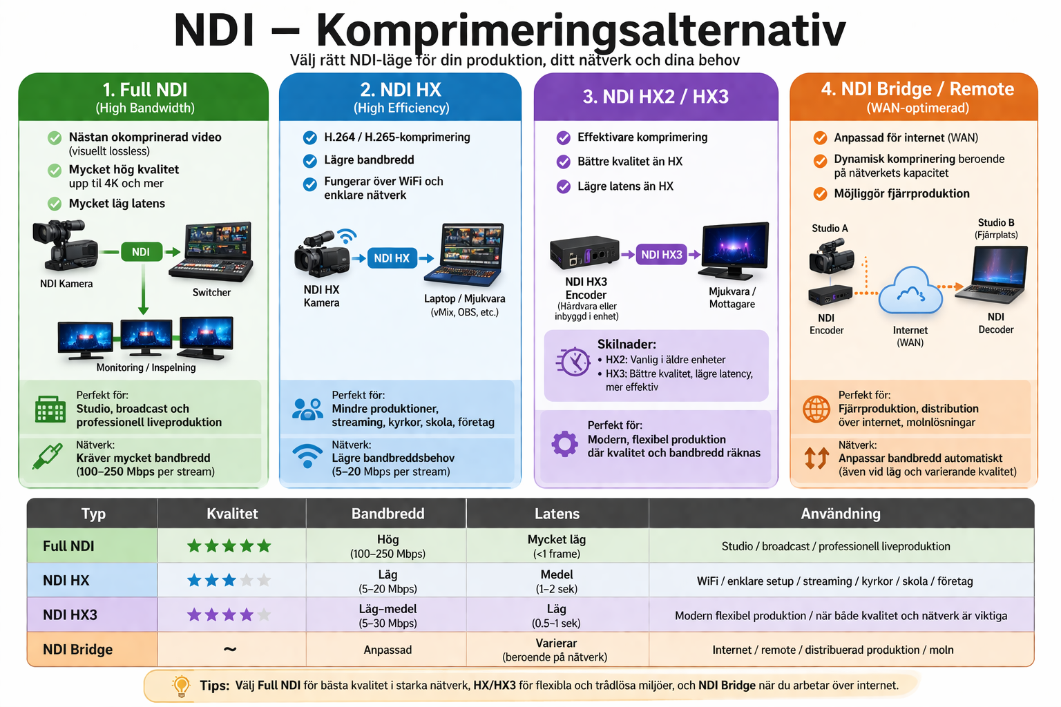 Ett företag kallat NewTek, som tillverkar videoredigering och produktionsutrustning, skapade 2015 NDI (Network Device Interface). Från början var det ett, i princip, helt okomprimerat, lossless protokoll som skickar en YUV4:2:2 signal, det vill säga samma bildformat du matar in i din TV. Med tiden har man adderat komprimerande varianter ned till NDI HX3 som använder H.265. Gemensamt för alla är att du behöver köpa en licenser från tillverkaren för att använda formatet.