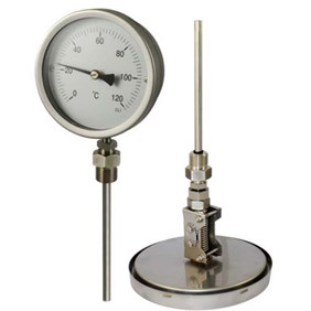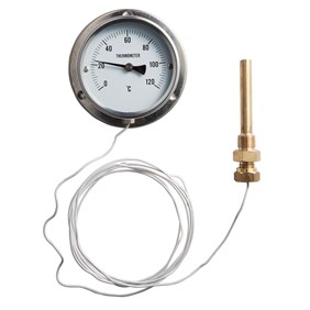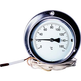 Termometer för temperaturmätning av vatten, rökgas eller avgas när avläsning önskas på annan plats än vid mediet. Hus i förnicklat stål eller rostfritt stål diameter 100 mm. Fläns i bakkant. Kapillärledning i olika längder upp till 10 meter. Slät känselkropp och anslutningsficka i mässing, stål eller rostfritt syrafast stål. Erbjuds med flera olika graderingar. Finns även med ställbara kontakter för larmsignal svag- och starkström.